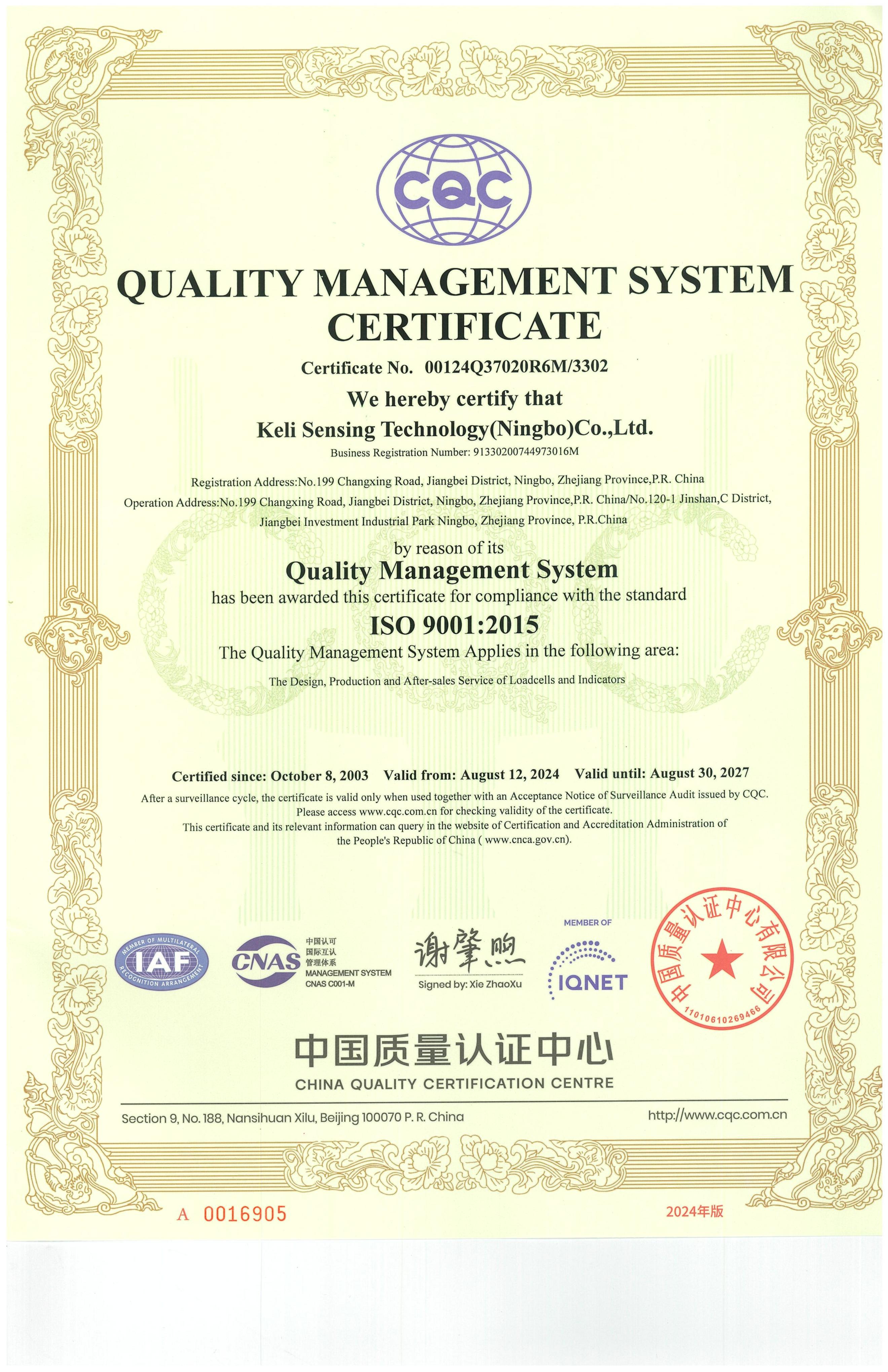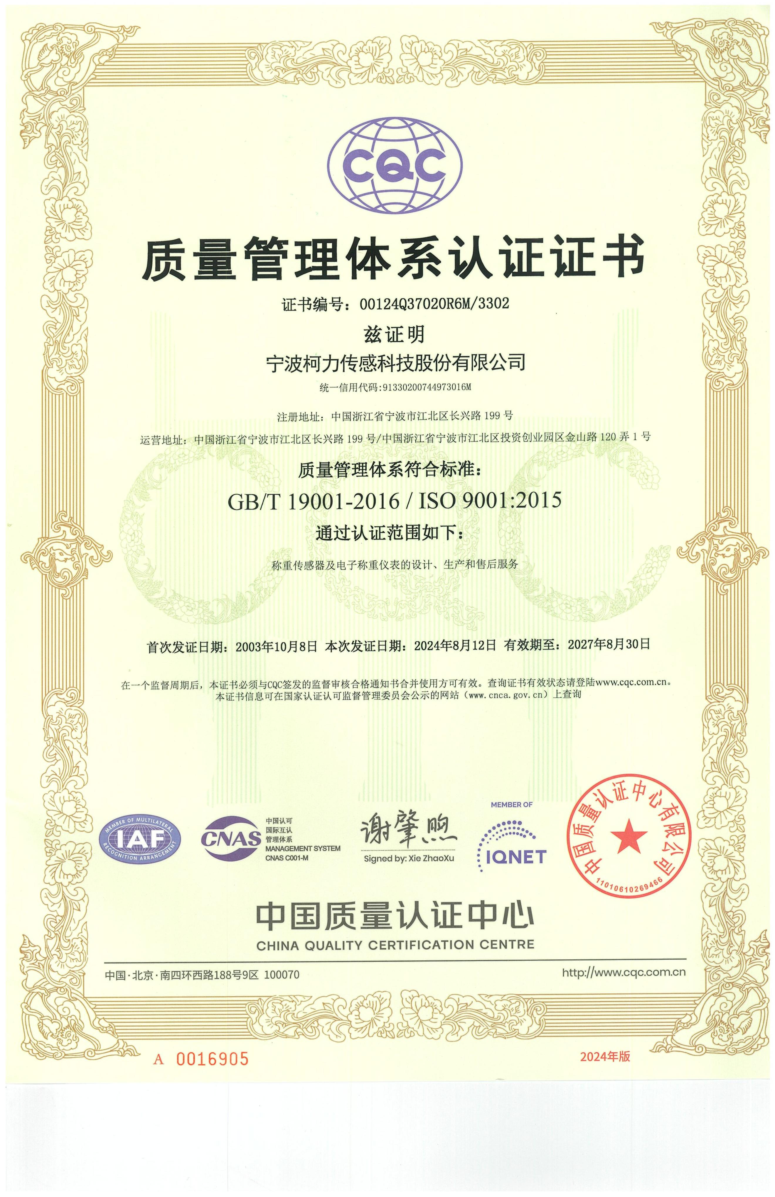 型式批準(zhǔn)證書(shū)SQB(鄭州柯力)