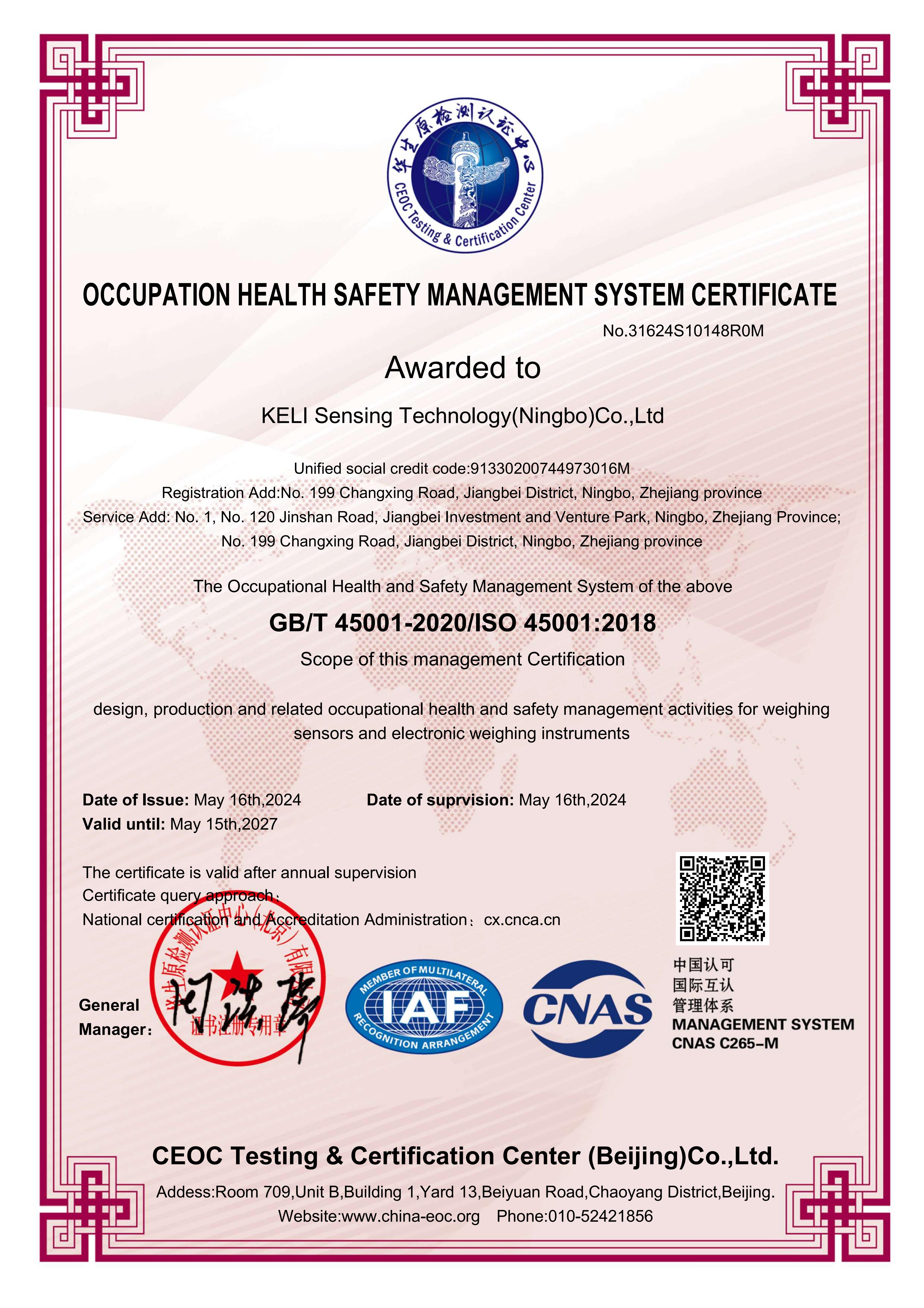 職業(yè)健康安全管理體系認(rèn)證證書(shū)(中文)(證書(shū)有效日期:2027年05月15日)